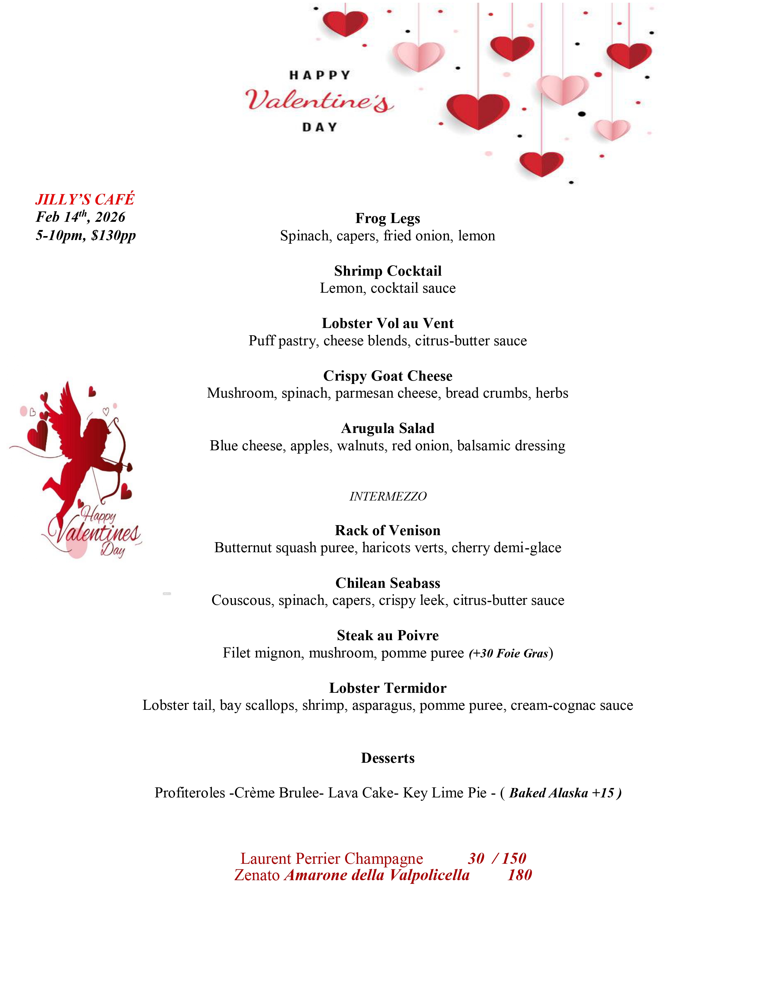 Celebrate Valentine’s Day at Jilly’s Café with an elegant multi-course dinner featuring refined flavors, premium ingredients, and classic favorites. Join us for a romantic evening paired with fine wine and champagne. ❤️ Available on February 14th, no regular menu that day!